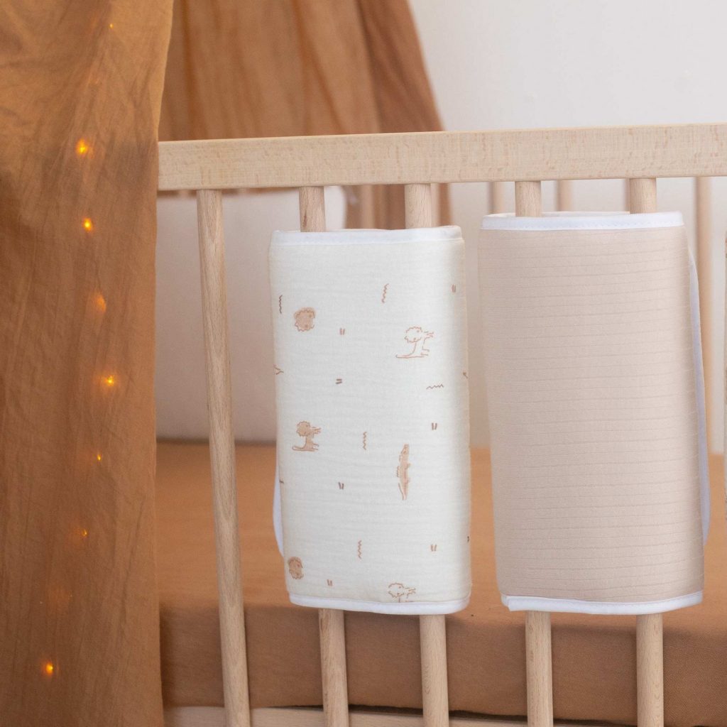 - Tour de lit modulable : Il existe également des tours de lits modulables, ou protèges barreaux. Il s’agit d’un système de « coussin » qui vous permettra de personnaliser la taille et le positionnement du tour de lit. Chaque pièce est doté d’un scratch et vient protéger les barreaux.