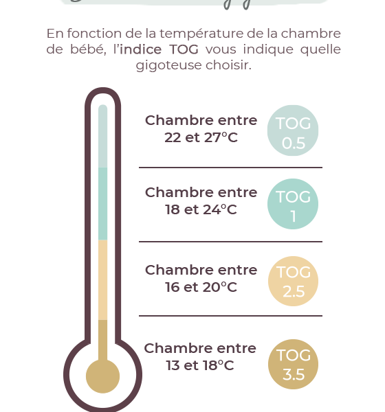 De plus en plus répandu, le TOG est une indication mise à la disposition du particulier pour choisir efficacement la gigoteuse de son enfant, en fonction de la température de sa chambre. Celle-ci évolue au rythme des saisons. Il existe plusieurs matières sur le marché comme le velours, la popeline de coton ou encore l’éponge.