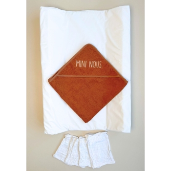 Dieses Set besteht aus einer Wickelauflage mit einem kleinen Loch an der Seite. Ihr kleiner Makel beeinträchtigt die Nutzung nicht, und wir haben einen Wickelauflagenbezug aus Baumwollmusselin hinzugefügt. Der Baby-Badeponcho Mini Nous in Kamelbraun wird ohne Handschuh und ohne Verpackung verkauft. Das Waschhandschuh-Set, das normalerweise aus 5 Teilen besteht, umfasst insgesamt 4 Handschuhe.