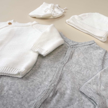 Gratulieren Sie den neuen Eltern mit unserem Pack Mini Nous. Eine Aufmerksamkeit in zeitlosen Farben, die Einstimmigkeit finden wird! Zusammengesetzt aus Strick und Samt, sind die in diesem Geschenkset enthaltenen Materialien sorgfältig ausgewählt, um das Baby von seinen ersten Lebenstagen an warm zu halten. Mit diesem Geschenk sind Sie sicher, dass Sie nichts falsch machen.