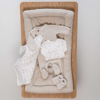 Die neutralen und eleganten Farben dieses Pakets bringen einen Hauch von Sanftheit mit sich, der sowohl für Mädchen als auch für Jungen geeignet ist und ein beruhigendes Universum schafft, während es trendig bleibt. Das Beige evoziert Wärme und Zärtlichkeit, ideal um das Neugeborene von den ersten Tagen an in einen Kokon des Komforts zu hüllen.