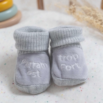 Dieses Paar Erstlingsschuhe ist für Neugeborene geeignet und bietet die Wärme, die sie benötigen. Zur Verwendung ab der Geburt bis etwa zum 1. Monat können Sie dem zukünftigen Paten auf originelle Weise die gute Nachricht überbringen. Eine hochwertige graue Stickerei ist auf der Oberseite mit der Aufschrift "Pate ist zu stark" vorhanden.