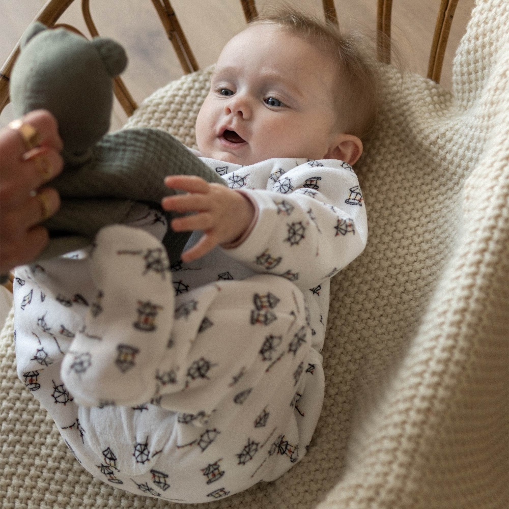 Dieser Baby-Nickischlafanzug – Jahrmarkt wurde speziell entwickelt, um Ihrem Kind ruhige Nächte zu bieten und gleichzeitig maximalen Komfort und Praktikabilität im Alltag zu gewährleisten. Dank seines weichen und angenehmen Nickistoffs umhüllt dieser Nickischlafanzug das Baby mit einem Gefühl von Wärme und Wohlbefinden, ideal für den Schlaf und Entspannungsmomente. Dieser Babyschlafanzug hilft somit, eine angenehme Körpertemperatur die ganze Nacht über aufrechtzuerhalten und fördert einen ruhigeren Schlaf. Die Öffnung auf der Rückseite wurde entwickelt, um das An- und Ausziehen zu vereinfachen. Sie ermöglicht es, das Kleidungsstück leicht an- und auszuziehen, ohne das Baby zu stören, selbst wenn es schläft. Dieses System ist besonders praktisch für junge Eltern, insbesondere beim nächtlichen Wickeln, wo jede Bewegung zählt. Der Schnitt ist darauf ausgelegt, die natürlichen Bewegungen des Babys zu respektieren. Er gewährleistet optimale Bewegungsfreiheit ohne Kompression, damit sich das Kind im Schlaf frei bewegen kann. Der Stoff behält seine Weichheit und Form nach jedem Waschen und garantiert eine langlebige Nutzung.