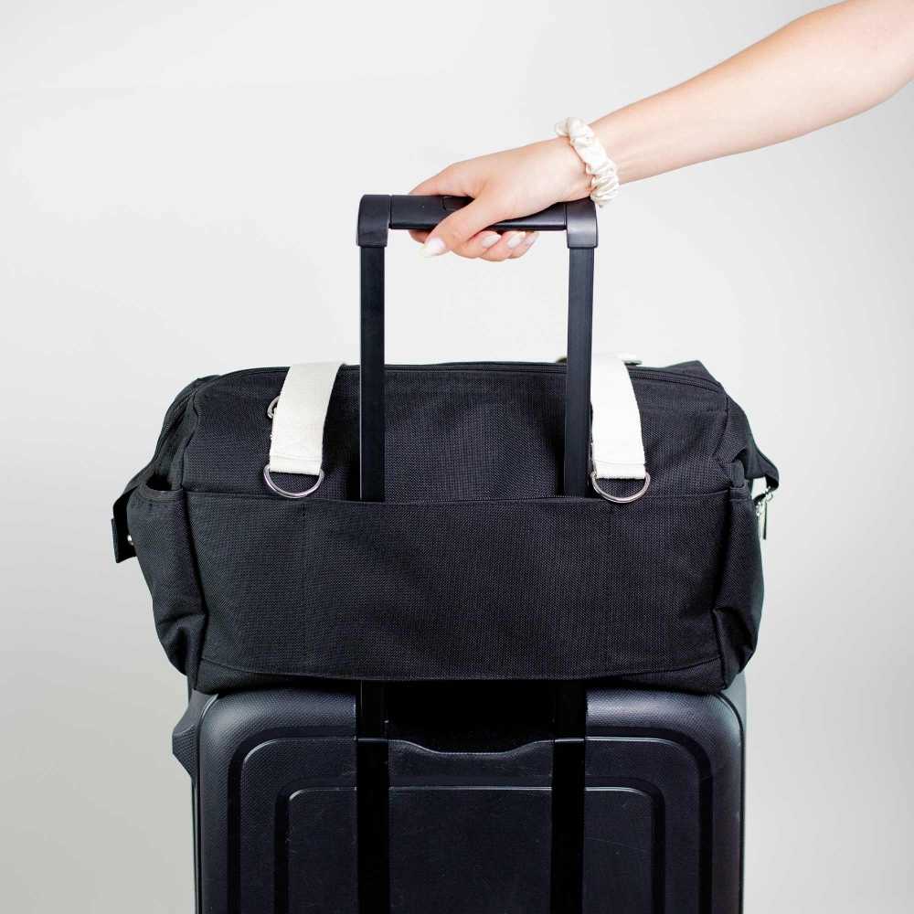 Leicht, ergonomisch und mit einer seitlichen Tasche speziell für die Flasche ausgestattet, lässt sie sich im Alltag leicht tragen. Ihre elegante schwarze Farbe vermeidet wiederholte Flecken und passt sowohl zum Stil der Mama als auch zu dem des Papas.