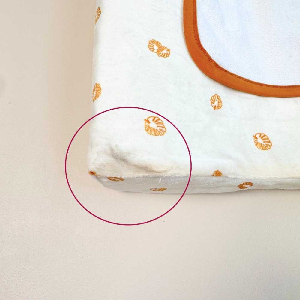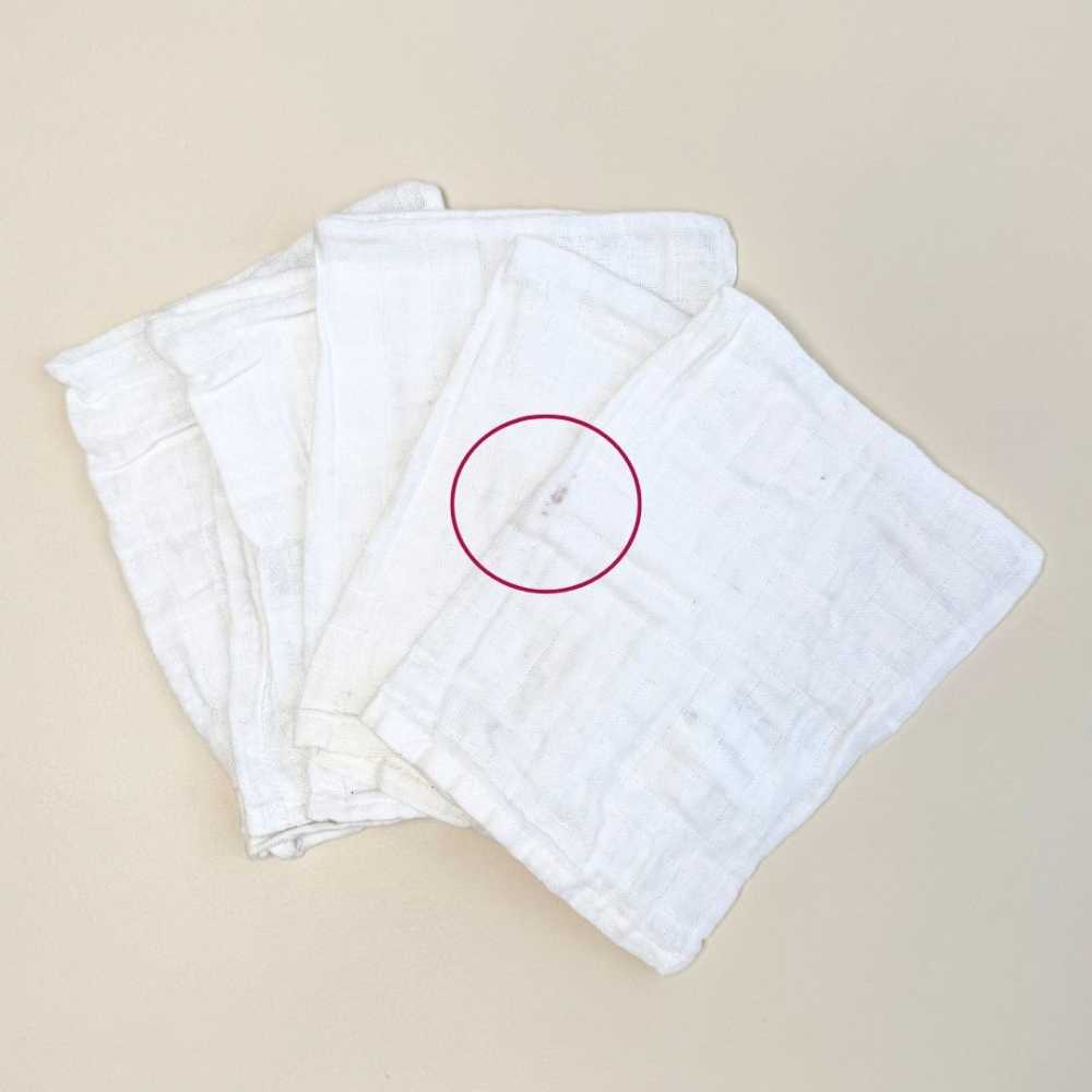 The hooded bath cape for newborns from this newborn changing set is delivered without packaging. The soft velvet changing mat and the pack of 5 muslin washcloths for infants are slightly stained. A hand wash with a little soap will be enough to make them look like new.