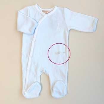 The white and pastel blue Sophie La Girafe© velour sleepsuits are slightly stained. A simple wash with a little stain remover will be enough to fix their little flaw. The navy blue front-opening sleepsuit has an iron-on defect that should also come out in the machine.