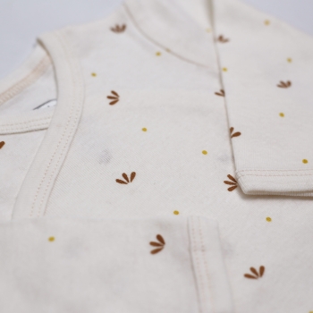 This long-sleeved baby bodysuit made of cotton is the perfect choice to dress your newborn with style and comfort. Made from 100% cotton, it ensures unparalleled softness and great breathability, guaranteeing optimal comfort for babies' delicate skin. The heathered beige color, adorned with delicate terracotta flower petal patterns, adds an elegant and modern touch to this essential garment. Easy to put on, this bodysuit opens at the front with snap buttons, offering a practical solution for quick diaper changes, especially during the first months when changes are frequent. The long sleeves provide extra protection against the cold while remaining light and comfortable for everyday use.