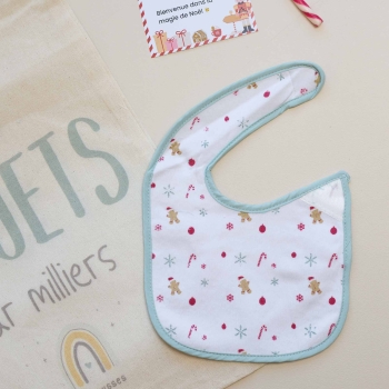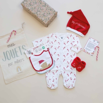 This gift set has all the essentials for a magical first Christmas. In addition to the memory, it will be perfectly suited to newborns with a 1-month size pajama, a lovely Christmas hat, a pair of 0/1 month slippers, a set of 2 newborn bibs with soft Velcro on the side made of cotton with a soft laminated membrane between two layers, and a lovely cotton toy bag with a linen effect to store the outfit or put baby's Christmas toys.