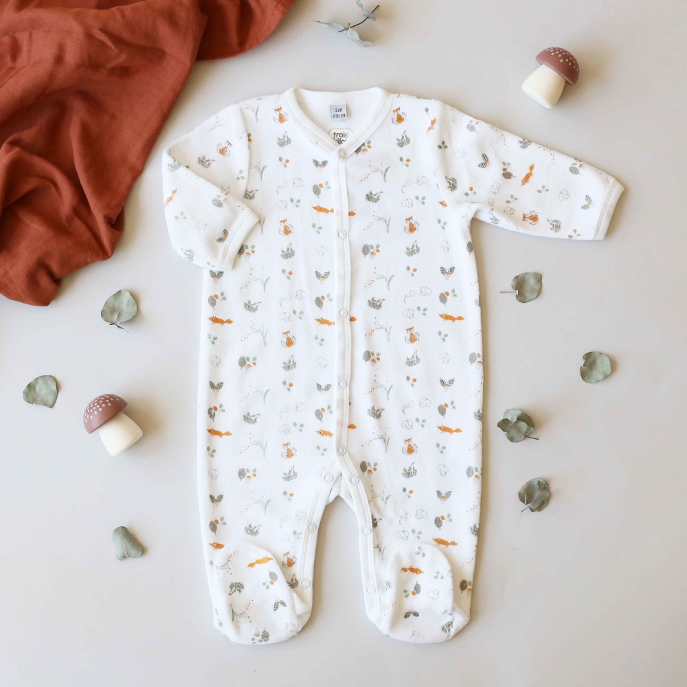 Made from soft velour, this newborn sleepsuit keeps baby warm while respecting their delicate skin. The fabric is supple, breathable and adapted to the movements of little ones during the night. This white sleepsuit easily matches other pieces in the layette such as bonnets, sleeping bags or booties. It is suitable both for home and for the maternity ward, and can be slipped into a birth bag.