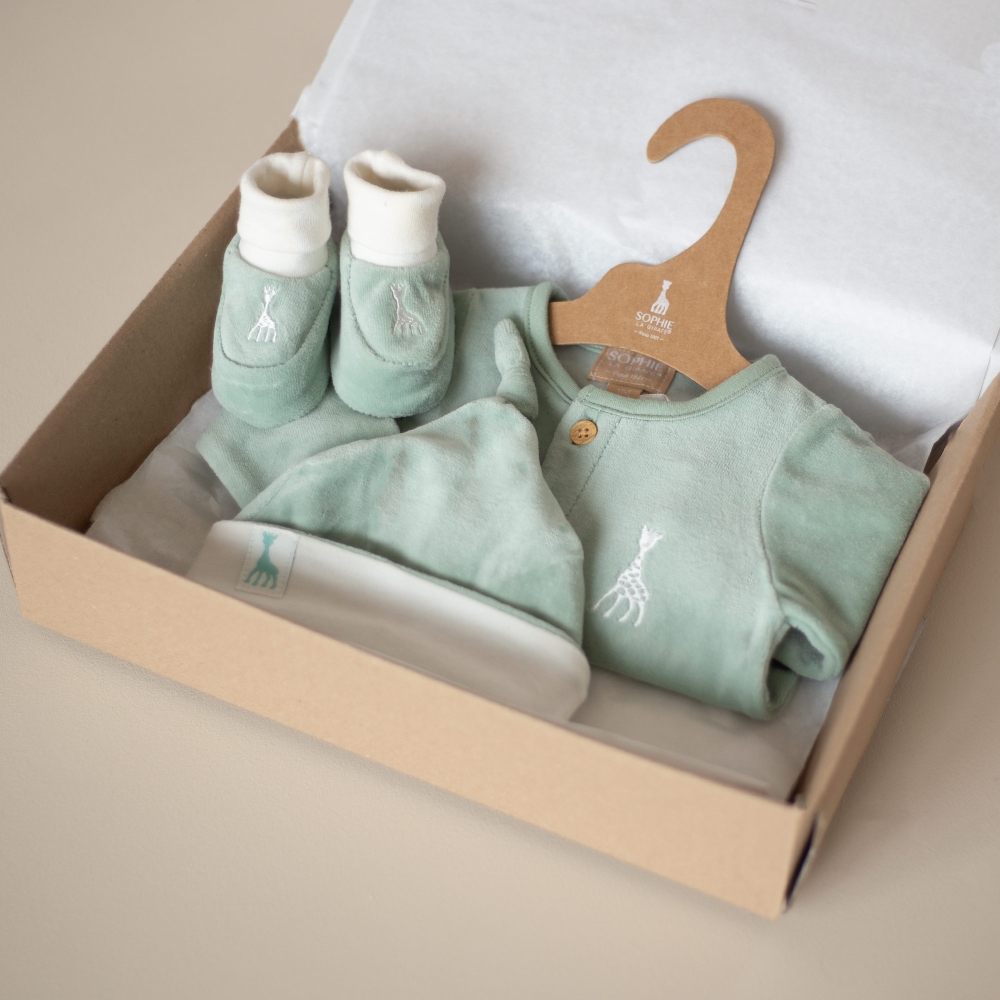 Ofrezca un pack nacimiento 0/1 mes a los futuros padres con la imagen de la célebre Sophie la Jirafa. Compuesto por 3 piezas indispensables, se trata de un cofre regalo completo y cualitativo.