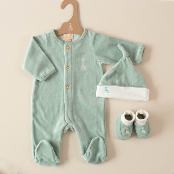 Regalo muy apreciado por los padres, descubra nuestro cofre de nacimiento Sophie la jirafa. Compuesto por 3 productos esenciales para el nacimiento del bebé, encontrará un pijama de nacimiento. Abriéndose por delante, será fácil de poner al bebé limitando las manipulaciones. En terciopelo muy suave, aportará calor y confort al bebé. Un gorro de terciopelo permitirá mantener la cabeza del bebé bien calentita. Forrado en algodón, será tan agradable de llevar como caliente. Por último, encontrará un par de patucos cálidos y mullidos. Este lote de 3 productos se ofrece en talla 0/1 mes para el gorro y los patucos y el pijama es en 0 meses.