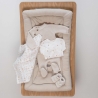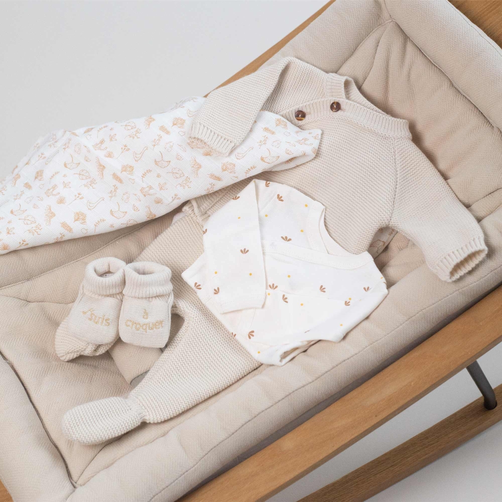 Los colores neutros y elegantes de este pack aportan un toque de dulzura que conviene tanto a las niñas como a los niños, creando un universo relajante y a la vez moderno. El beige evoca la calidez y la ternura, ideal para envolver al recién nacido en un capullo de confort desde sus primeros días.