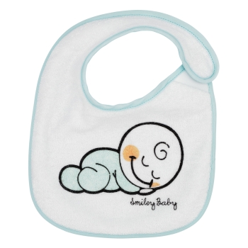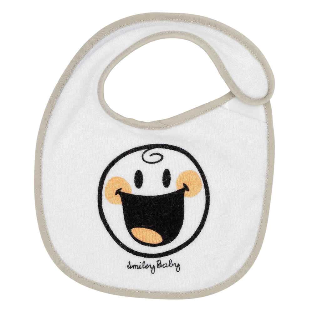 - Cada uno de estos baberos para bebé están decorados con SMILEY BABY®. El primero es blanco liso con ribete amarillo a juego con la carita sonriente del bebé que aparece encima. El segundo está lleno de alegría, liso naranja con ribete amarillo para aportar el máximo de energía, un bebé feliz aparece con los brazos abiertos listos para un abrazo.