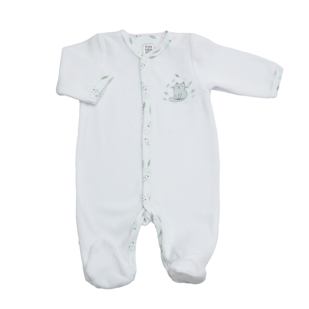 - 1 pijama en terciopelo con apertura delantera por broches blanco con estampado de gatito en el pecho