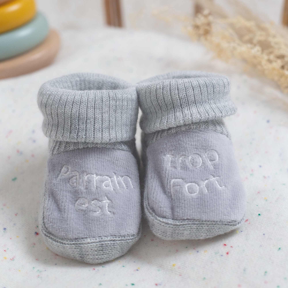 Este par de zapatitos de nacimiento está adaptado a los recién nacidos y aporta el calor que necesita. Para usar desde el nacimiento y hasta aproximadamente 1 mes, podrás anunciar de forma original la buena noticia al futuro padrino. Un bordado gris de calidad está presente en la parte superior con la inscripción u00ABel padrino es genialu00BB.