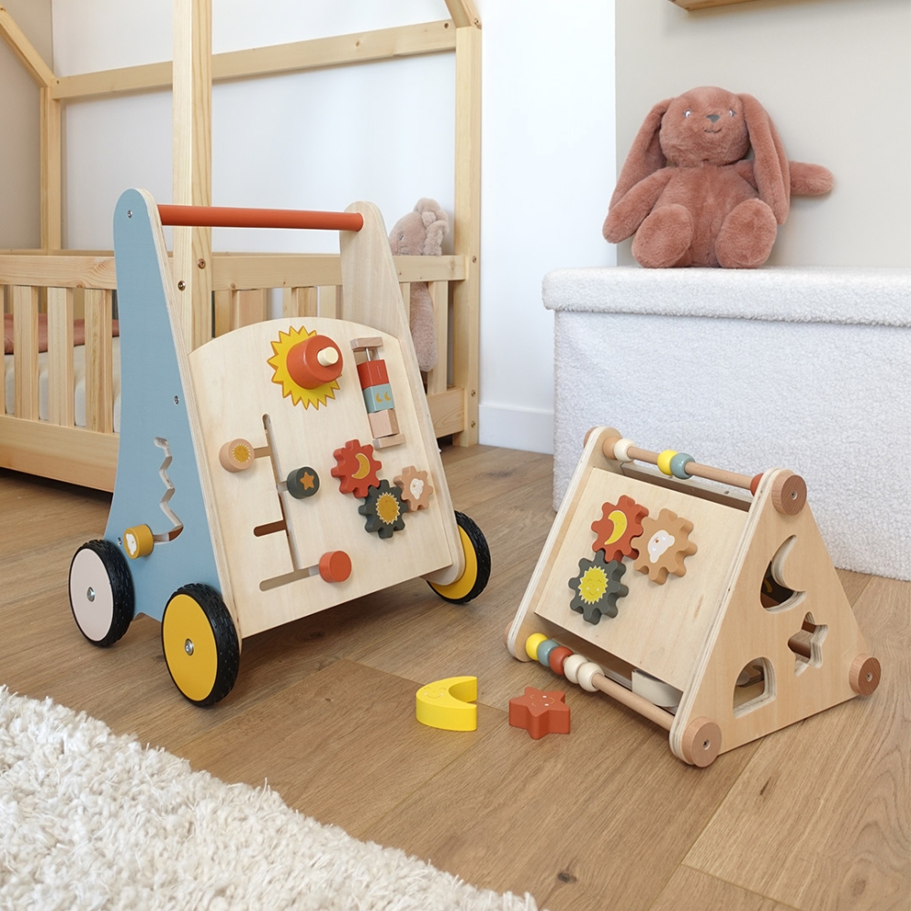Entre le labyrinthe à faire glisser, les petites perles à manipuler, les engrenages à faire tourner ou encore les formes à encastrer (lune, étoile, arc-en-ciel), chaque détail a été conçu pour éveiller sa curiosité. L’horloge avec ses aiguilles mobiles permet aussi de se familiariser, en douceur, avec la notion du temps.