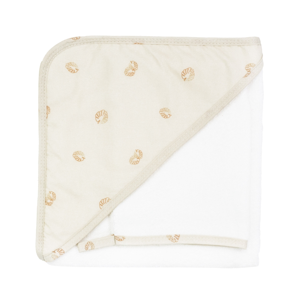 Retrouvez également le nécessaire pour la sortie de bain de bébé en l'enrobant de douceur dans une serviette à capuche pour nourrisson aux tendres motifs de feuilles. Le gant en éponge assorti vous permettra de sécher plus aisément les petits plis de bébé.