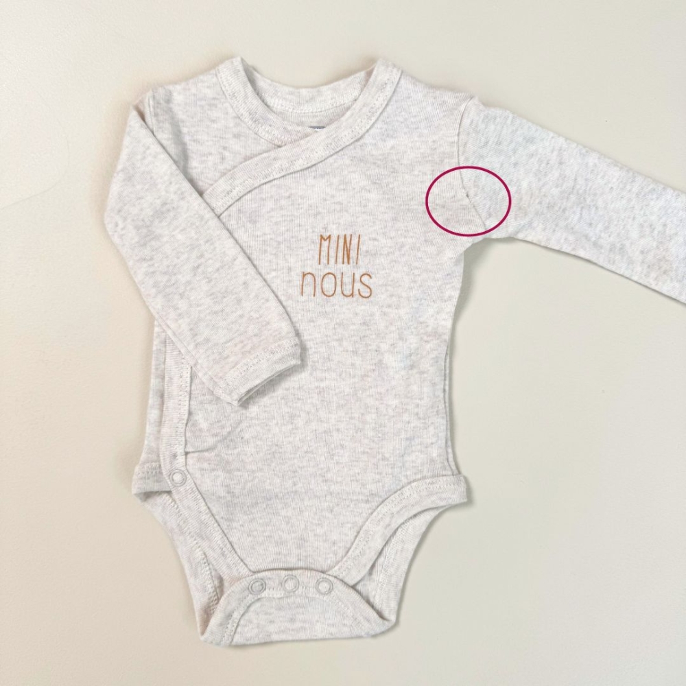 Le body orné de l'imprimé "Mini nous" est légèrement décousu. Quelques points de couture suffiront pour le remettre à neuf. Le body aux motifs pétales dispose d'un légère tache au niveau du col qui partira aisément avec un peu de détachant.