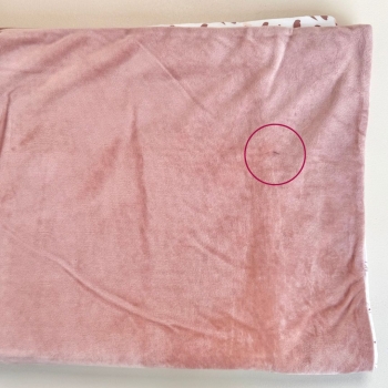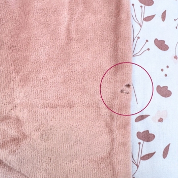 La couverture pour bébé a un défaut de velours et une légère tache qui n'empêche pas sa bonne utilisation. Le tour de lit en coton bio est démuni d'une de ses attaches. La turbulette sans manches zippée est tachée. Un passage en machine avec un peu de détachant suffira pour la remettre à neuf.