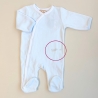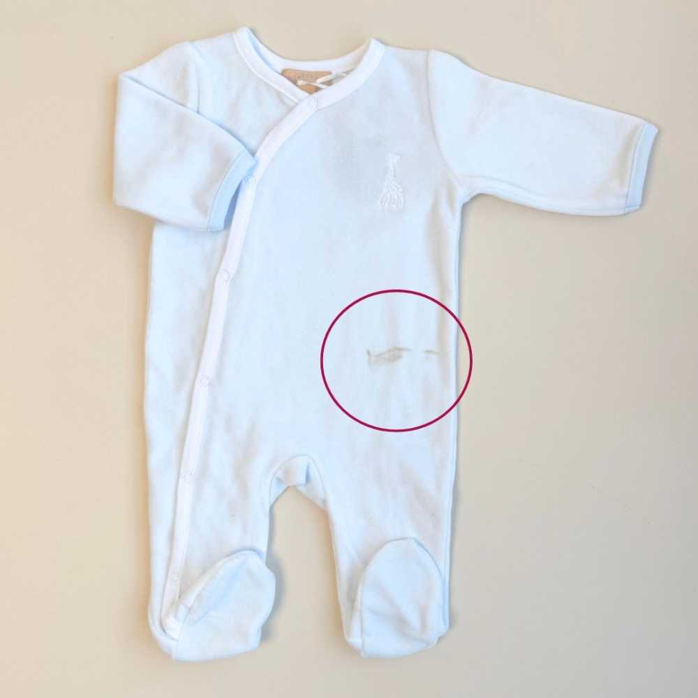 Les pyjamas en velours blanc et bleu pastel Sophie La Girafe© sont légèrement tachés. Un simple lavage avec un peu de détachant suffira pour faire partir leur petit bobo. Le pyjama ouverture devant bleu marine a un défaut de thermocollant qui devrait lui aussi partir en machine.