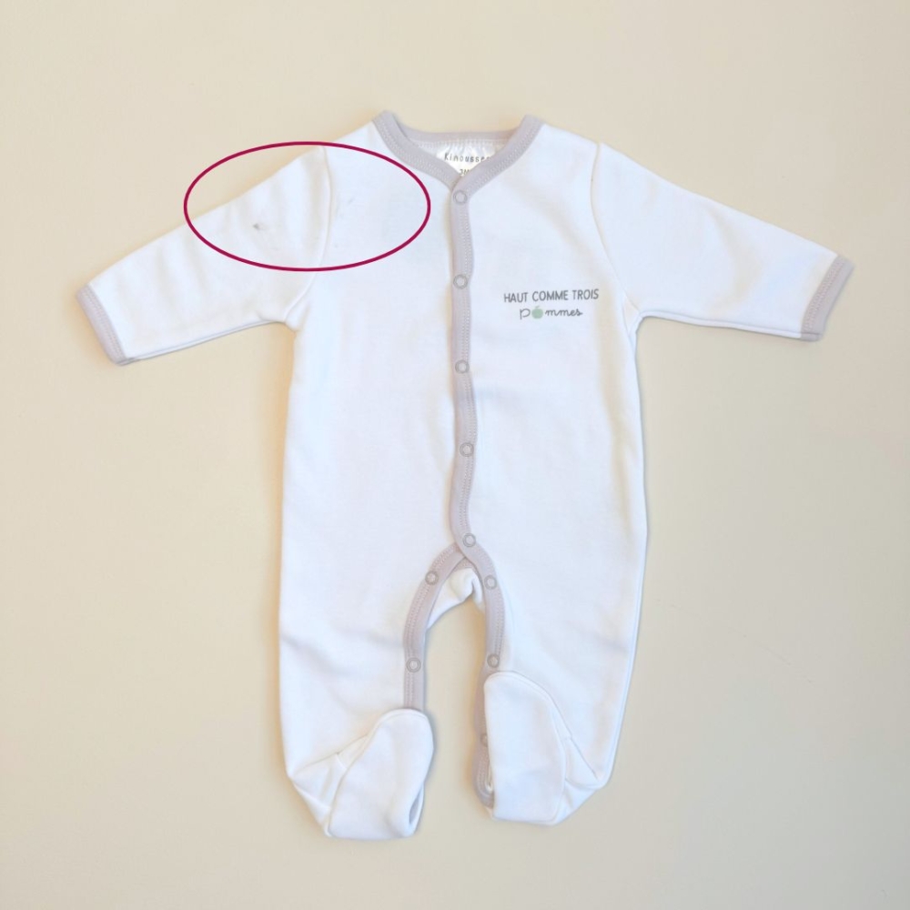 La brassière en maille grise pour bébé est légèrement décousue sur une des manches ce qui n'empêche pas son utilisation. Le pyjama pour bébé marqué "Haut comme Trois Pommes" est légèrement taché à l'avant. Un simple lavage avec un peu de détachant suffira pour lui donner une seconde vie. Le dors-bien aux motifs forêt est habituellement vendu en lot. Dans cet ensemble, il est vendu à l'unité.