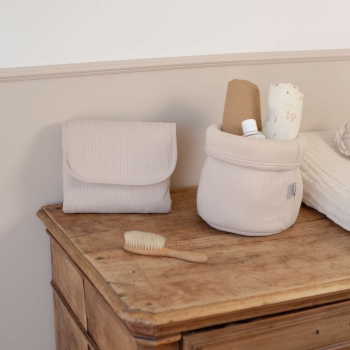 La partie intérieure, en éponge douce, assure un contact agréable pour la peau de votre enfant, tandis que la face extérieure en coton beige ajoute une touche discrète et élégante. Pratique au quotidien, ce tapis à langer de voyage est aussi équipé d’une pochette intégrée permettant de ranger une ou deux couches et quelques lingettes, pour avoir l’essentiel à portée de main sans s’encombrer.