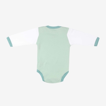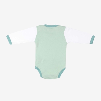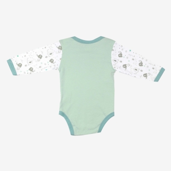 Scopri il nostro set di 2 body con elefanti a maniche lunghe. Con la loro apertura stile americano, potrai far passare il body attraverso la testa del tuo bambino. Questo permette di non dover togliere completamente il body durante il cambio del pannolino grazie ai 3 bottoni automatici presenti nel cavallo. Le maniche lunghe permettono anche di coprire bene le braccia del tuo bambino per mantenerlo al caldo. Il primo body bianco è ricoperto di piccoli elefanti grigi e bianchi. Ha anche dei tocchi di verde. Il secondo body è bianco con 3 motivi di elefante sul davanti. Il retro del body è verde chiaro con maniche bianche.