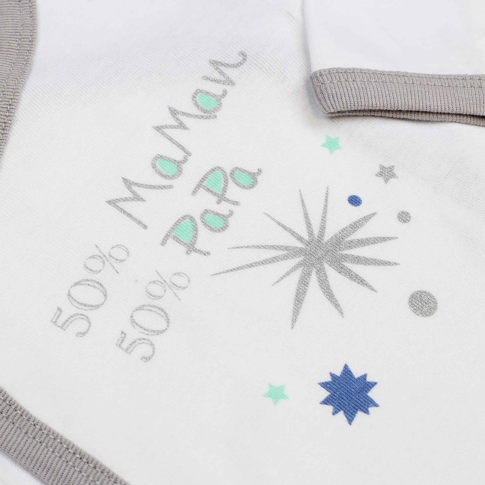 Scoprite il set di body incrociati per neonati, una scelta ideale per i neo-genitori alla ricerca di praticità e comfort. Ogni set include due body in cotone, uno bianco e l'altro verde acqua, perfetti sia per bambine che per bambini. Il modello con il motivo "50% mamma, 50% papà" aggiunge un tocco di fascino e tenerezza al guardaroba del vostro bambino.