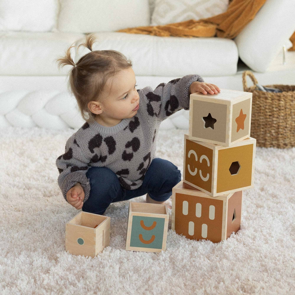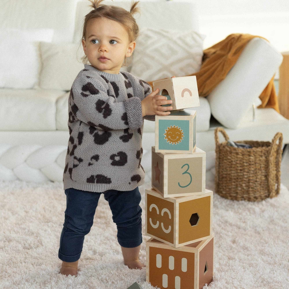 Scopri i nostri 5 cubi da impilare in legno certificati FSC® che permettono al bambino di creare una torre di quasi 60cm.
