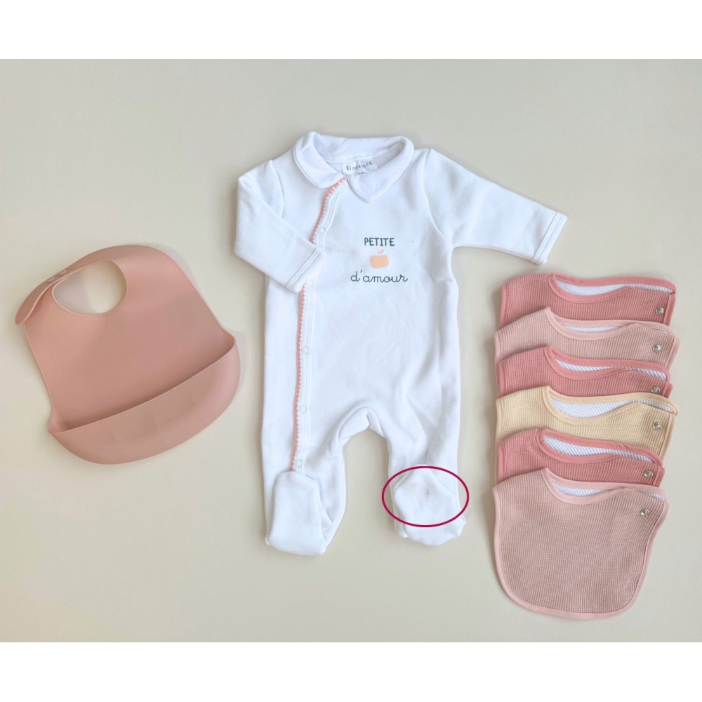 Il pigiama di questo set di essenziali per bebè bambina presenta una leggera macchia sotto uno dei piedini. Un semplice lavaggio con un po' di smacchiatore dovrebbe essere sufficiente per restituirgli il suo splendore. 1 bavaglino del set da 6 è macchiato sul retro. Il bavaglino in silicone per bebè è venduto senza la sua confezione.