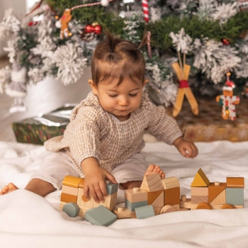 Bestaande uit 26 stukken, bestaat deze kleine houten trein uit 3 afneembare wagons. Alle blokjes kunnen worden gestapeld om de droomtrein van de baby te vormen. Met een lengte van ongeveer 42 cm is hij gemakkelijk vast te pakken en te laten rijden. De zachte kleuren en vormen zullen uw kind zachtjes doen ontwaken. Concentratie en behendigheid zullen aan bod komen met deze kleine stapelbare houten trein. Gemaakt van kwaliteitshout, FSC® gecertificeerd, wordt dit houten constructiespel verkocht in een kartonnen doos, klaar om cadeau te geven.