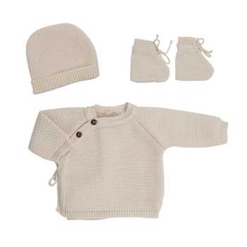 Verzorg uw baby met zachtheid en comfort. Deze set van vestje, slofjes en mutsje in tricot is perfect voor de eerste dagen van uw baby.