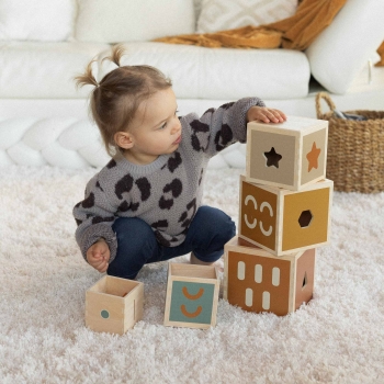 Ontdek onze 5 stapelbare houten kubussen met FSC®-certificering waarmee baby een toren van bijna 60 cm kan bouwen.