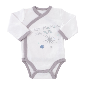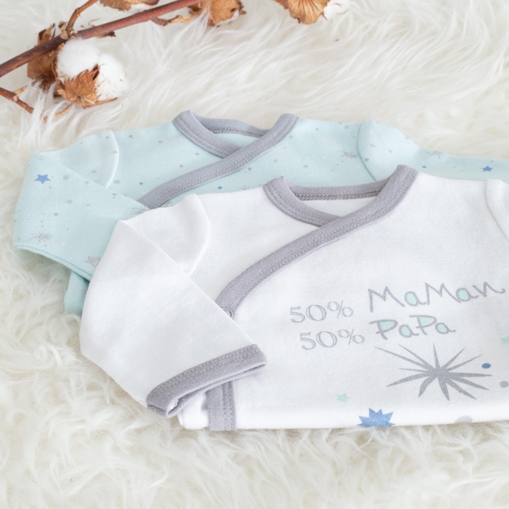 Ontdek de set overslag rompertjes voor baby, een ideale keuze voor jonge ouders op zoek naar praktisch gebruik en comfort. Elke set bevat twee katoenen rompertjes, één wit en één watergroen, perfect voor meisjes en jongens. Het model met het motief "50% mama, 50% papa" brengt een vleugje charme en tederheid in de garderobe van uw pasgeborene.