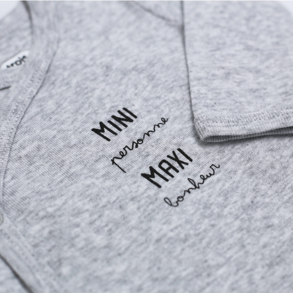 - Grijze gemêleerde kleur met een speelse opschrift "Mini persoon Maxi geluk"
